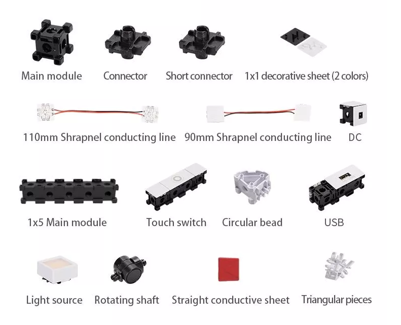 보시는 것처럼 깔끔한 박스에 각 블럭들이 포함되어 있습니다. LED 조명 블럭, 스위치 블럭, 전원공급 블럭, USB 충전 블럭, 내부 전원커넥터 케이블과 사용자가 상상하는 모양대로 조립할 수 있는 각각의 블럭들이 포함되어 있습니다. 그리고 각 블럭들을 조립할 수 있는 조립공구도 포함되어 있습니다.