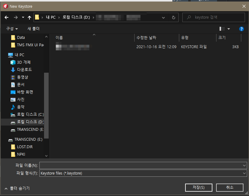원하는 폴더를 선택한 후, 원하는 이름으로 keysotre 파일을 생성해 줍니다.