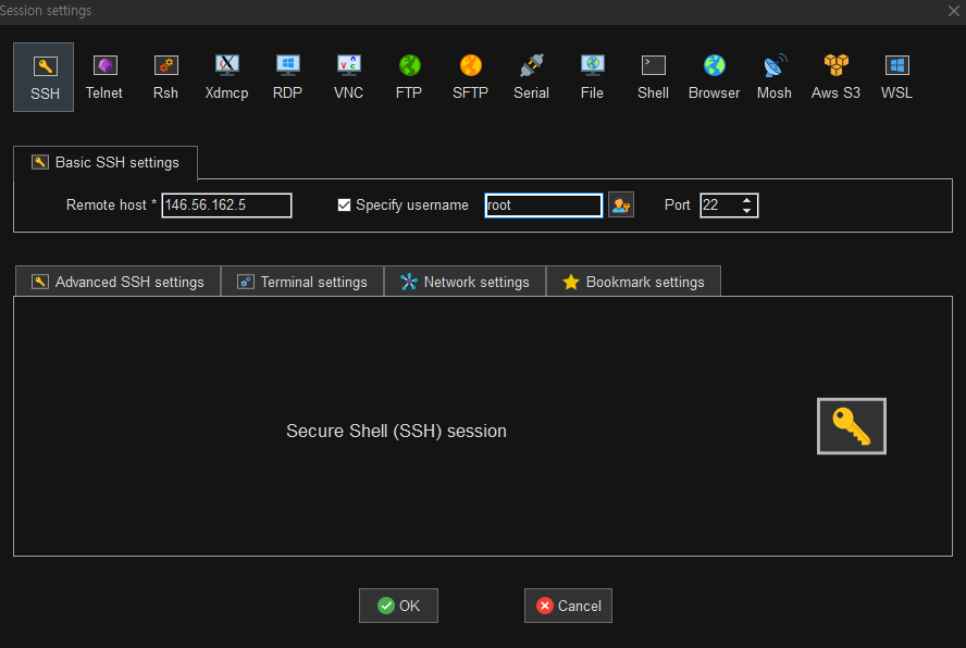 sshd restart로 서비스를 재시작하였다면 mobaterm에서 설정을 아래와 같이 수정하신 후