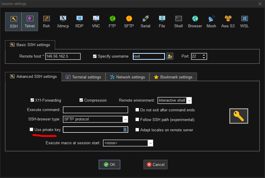 use private key 체크 박스를 해제해야 root로 접속할 수 있습니다.