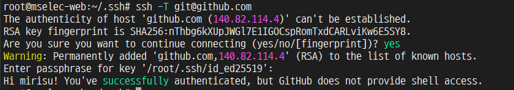 ssh키에 비밀번호를 지정한 경우 비밀번호를 입력받습니다. 인증에 성공하면 github 아이디까지 출력이 됩니다.