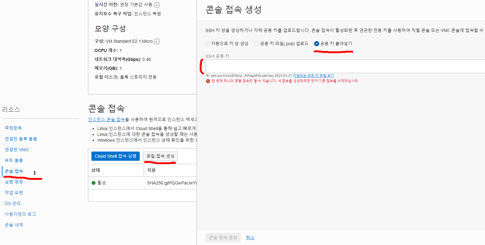 콘솔접속->로컬 접속 생성-> 공용키 붙여 넣기 순서로 하셔야 합니다.