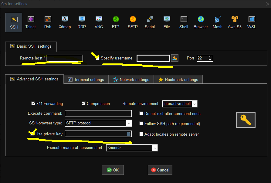 ssh로 서버 접속하기에서 설명 되었던 private key는 아래의 Use private key를 체크하고 다운받았던 private key파일의 경로를 선택하여 주면 됩니다.