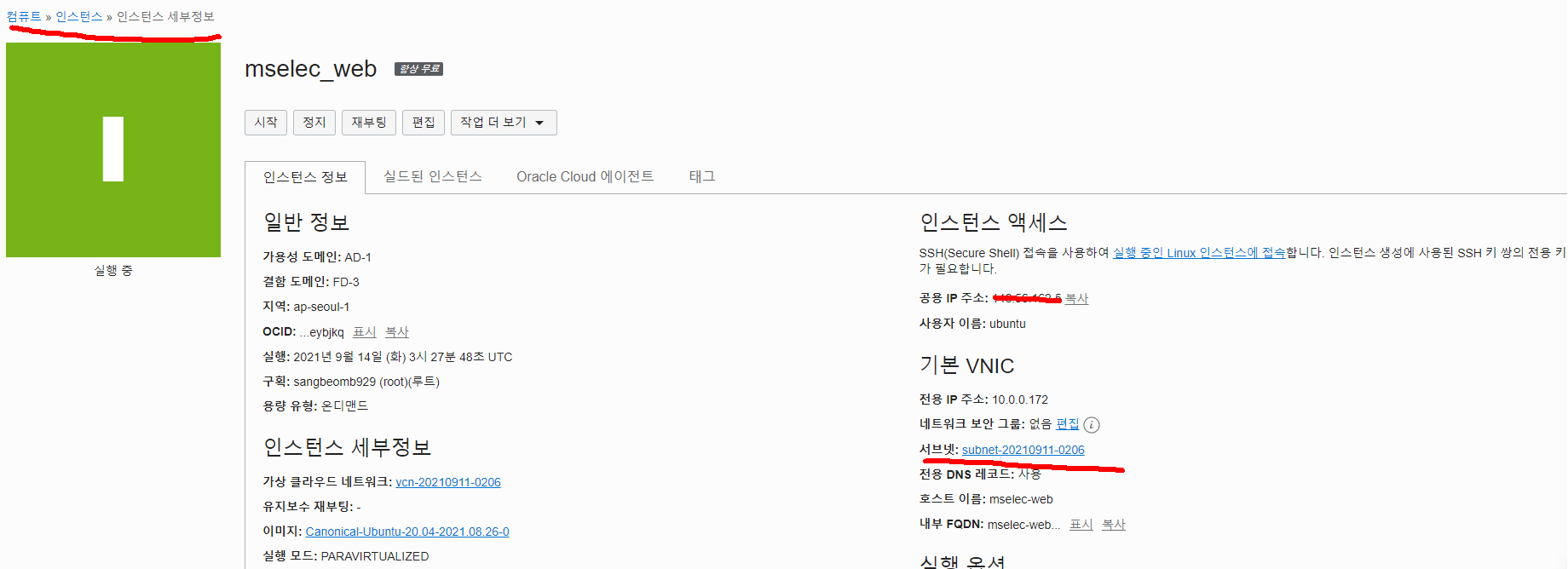 컴퓨트>인스턴스>서버선택> 서버 인스탄스 상세페이지로 이동합니다.
